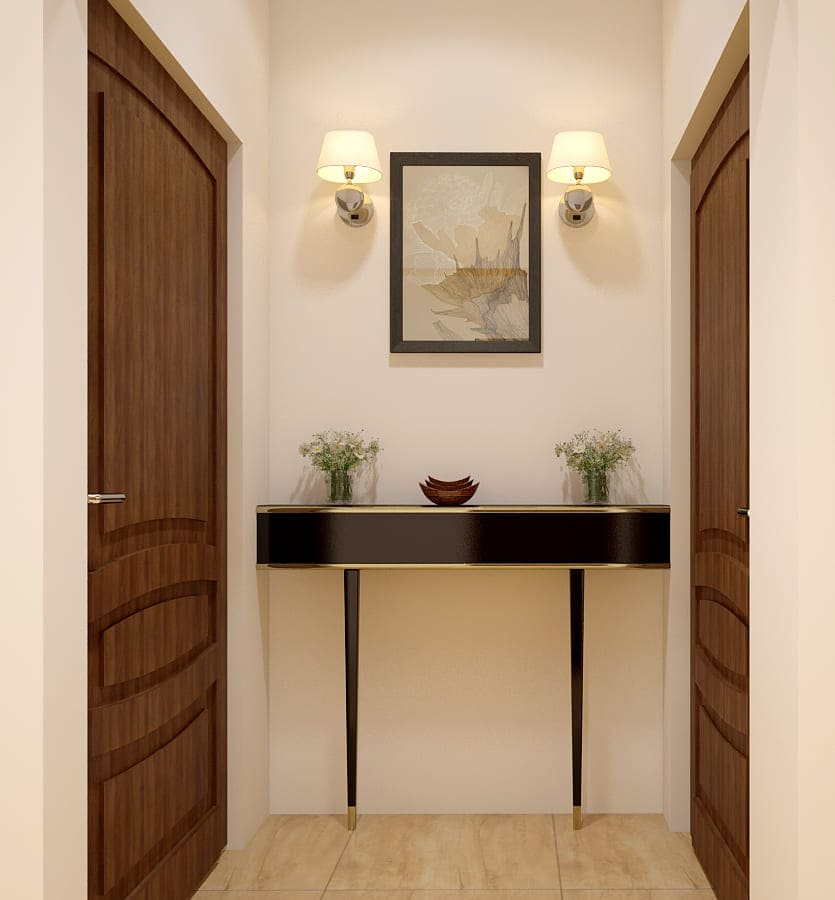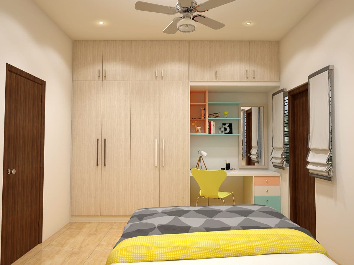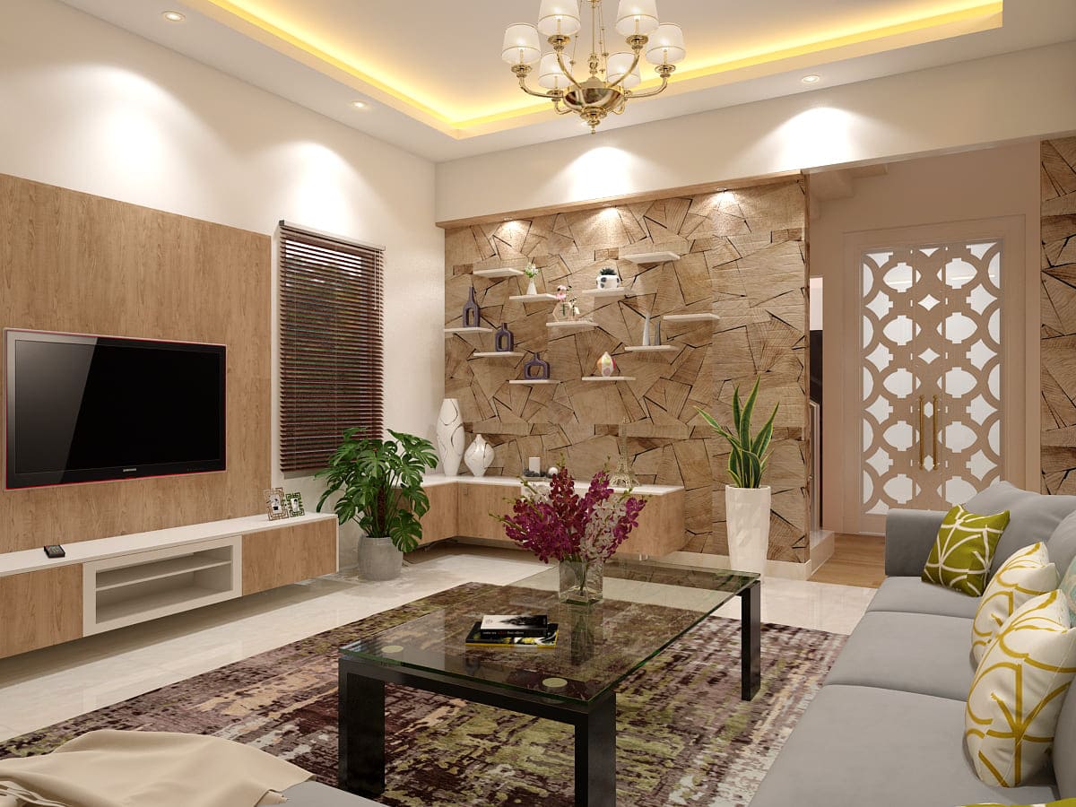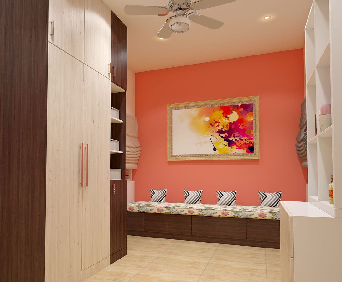 Our design team blended beige and greys with white to give that spacious look. The peach nook is perfect for reading or putting on some great music to relax in the evening. Stylish study desks, loads of cabinets and wardrobe space. Modular kitchen that has everything neatly tucked into the compact space. The living room is uber classy, grey sofa, glass table and wonderfully designed walls. Warm lighting, simple and neat looking TV unit and elegant wall shelves. Monstera Deliciosa and Snake Plant spreading freshness placed all around the room, abstract pattern carpet all grouped in for the budget-friendly duplex.